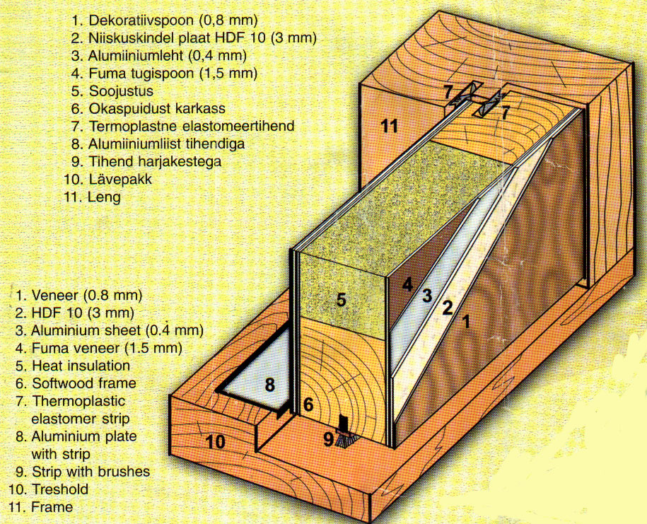 on valmistatud külmtõmmatud lehtmetallist, kasutades painutustehnoloogiat ja lehtmetalli valtsimist. Uste servad on valtsitud, karp on tervena painutatud. Lukkude piirkonda on täiendavalt paigaldatud 2 mm paksune metallplaat, lukud asetsevad metallkarbis. Ukse sees on jätkusribid, mis kindlustavad konstruktsiooni lisakaitse ja tugevuse. Ukseleht ning karp soojustatakse mittepõleva kivivillaga.............. |